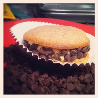 Sadly, Fall and Winter foods are no longer in season. Now if only the weather would just intuitively know this and STAY warm! Fortunately for me, I stocked up on cans of pumpkin. A lot. Of. Pumpkin. Today's craving IS pumpkin, and fortunately for me, I can have that! Just not in it's most delectable form, which is mixed in with cream cheese frosting, slapped between two fluffy, chewy cookies, and rolled around in mini chocolate chips. I suppose I can make something else with my many cans of pumpkin sitting wistfully in the pantry, but in the meantime, at least I can oogle this beaut in photos!