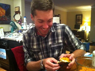 I made these for one of my best friends' birthday last year, and my boyfriend watched me bake in awe, fear, and a little disgust. Turns out, this guy right here (happy boyfriend, pictured below), was in heaven! Despite his initial apprehension, he will try just about anything at least once. And lucky for him, he did. They were delicious! And truth be told, I stole a few bites of his cupcake because they were THAT GOOD.