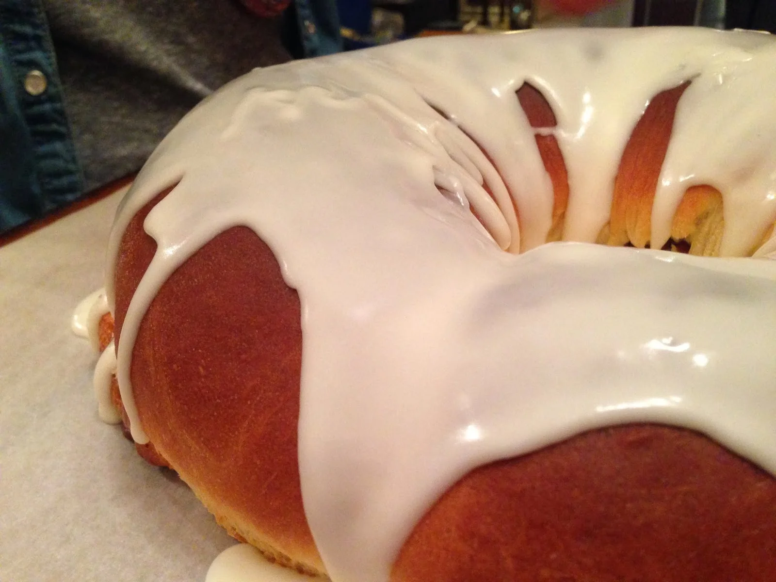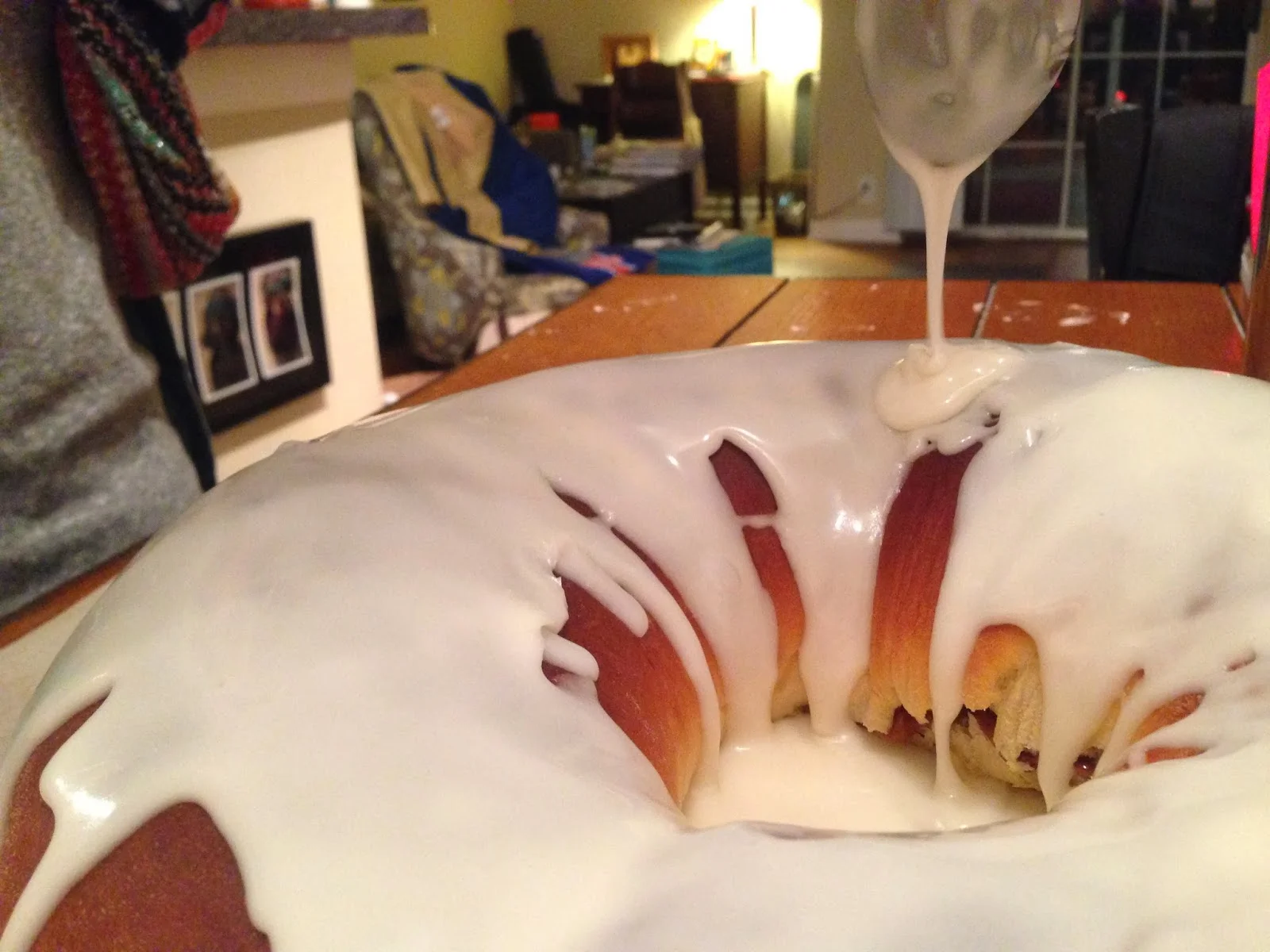 Since my trip to Argentina back in August, I've had a can of dulce de leche cooped up in our pantry for when I dreamt up more alfajores. Instead, I rolled used it to fill the king cake. Wise choice, I'd say. I topped the rest of it with bourbon icing and sprinkled the obligatory sanding sugar over top. Even I was impressed with the outcome!